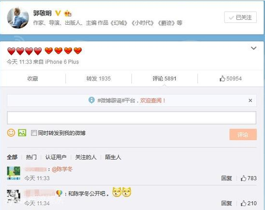 今天是七夕情人节,娱乐圈就一直好事不断。今日上午,郭敬明在微博连发了8个爱心,惹得网友大喊陈学冬!