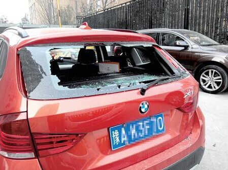昨日早上,宝马车主王女士发现爱车被砸,当即报了警。她说,前天晚上七八点,开车到车库口,保安拦着她,说她的停车卡到期了,不能进去。她说能不能续,保安说不能续,要买车位。