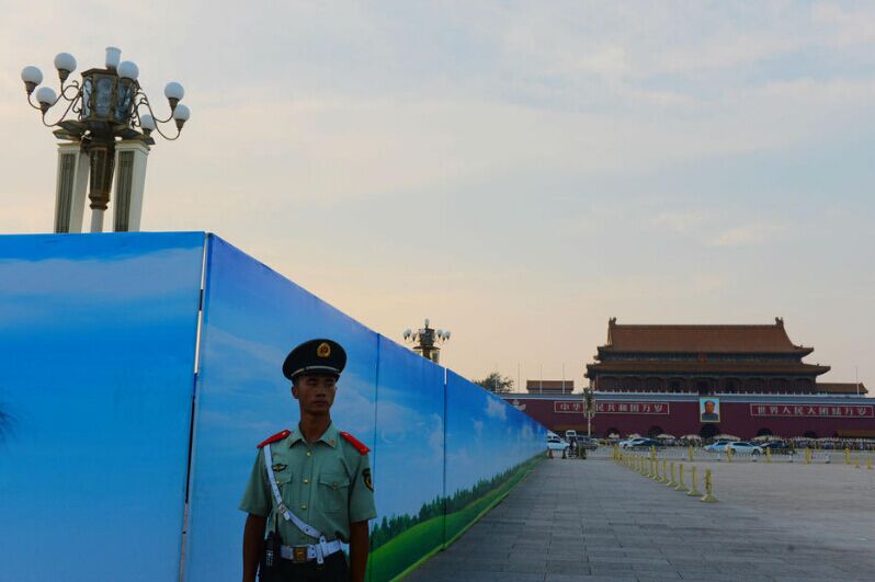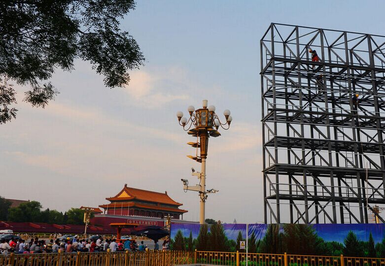 2015年8月8日,北京天安门广场上开始搭建电子大屏,两块大屏分别位于天安门广场东北角、西北角。